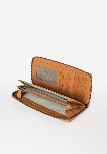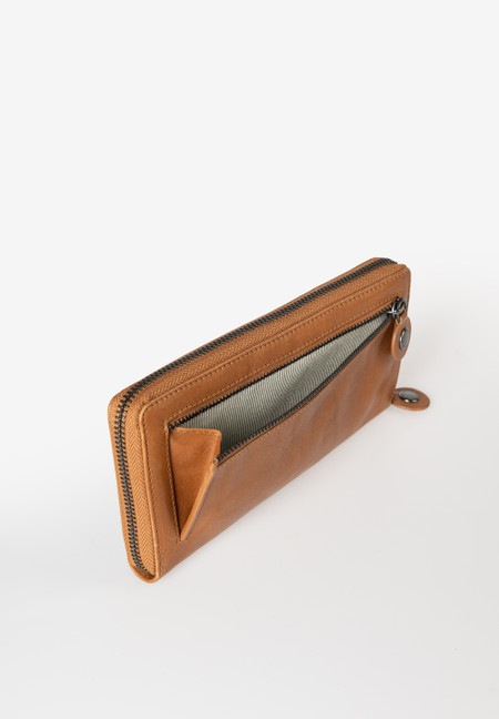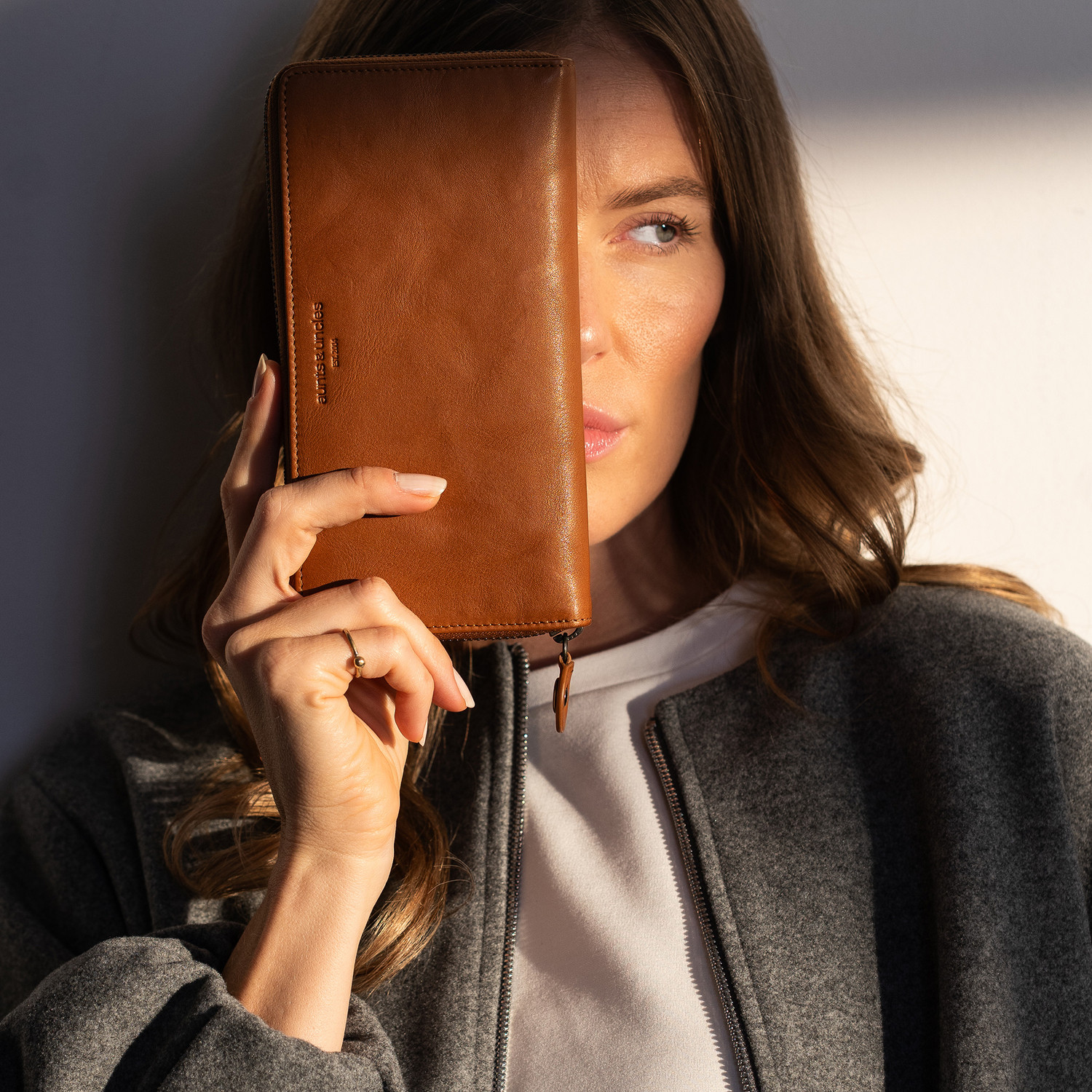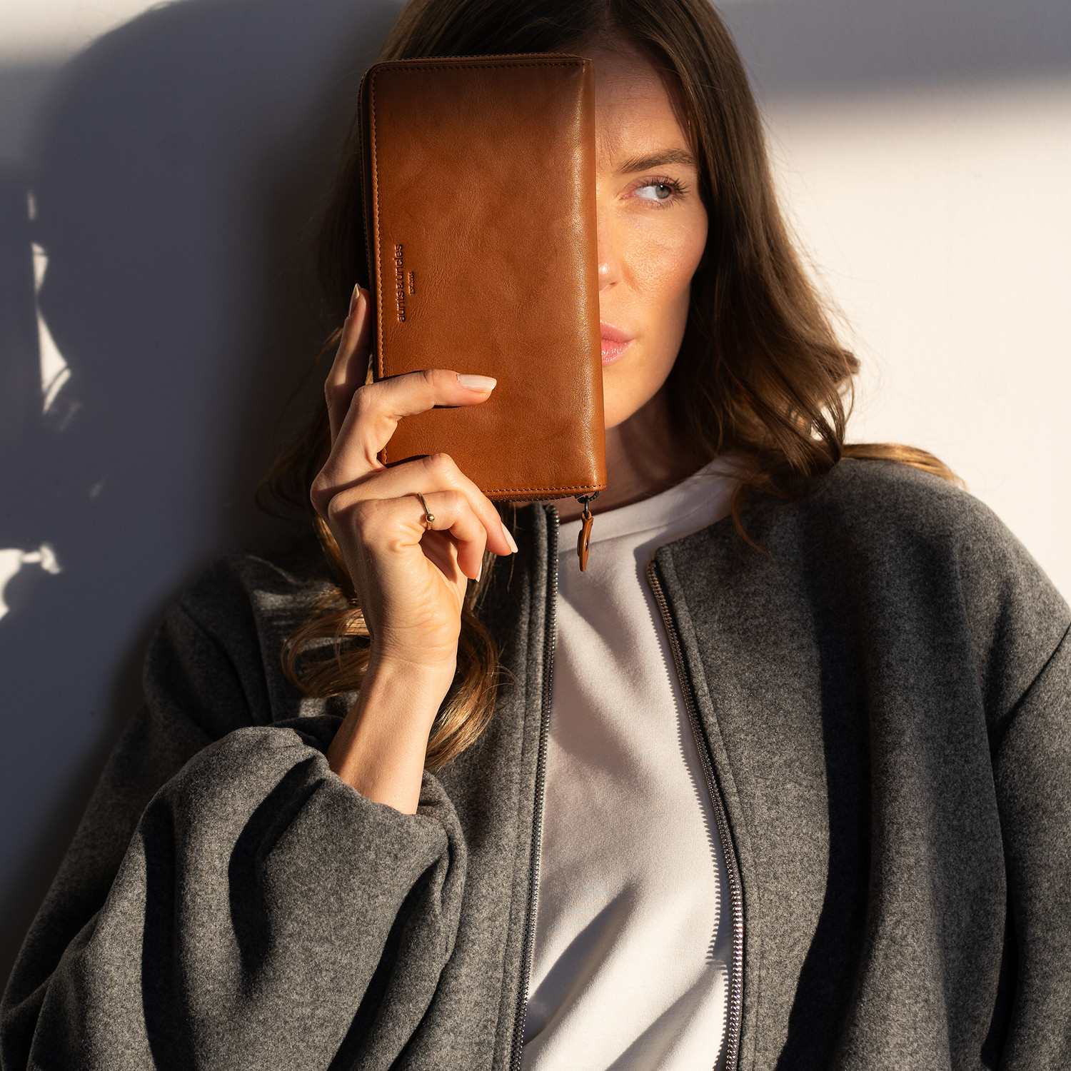 Cynthia is a large zippered wallet with a divided bill compartment, 14 card slots, a slim zipper pocket and three large, slim insert pockets for additional bills or receipts. There is an additional large zipper pocket on the back. Cynthia is made from sustainably tanned premium leather, which promises a long service life. To protect against data theft, the wallet with the all-round zipper is equipped with special RFID protection.