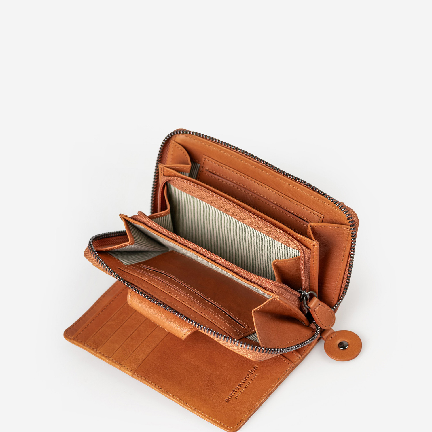 Francis is a two-part wallet made from sustainably tanned premium leather and is the larger version of Lesley. It has a fold-out compartment that closes with a flap and snap fastener. Another compartment can be closed with an all-round zipper. Francis has 14 card slots including a transparent one, four large insert pockets and a large zipper pocket on the inside. There are two additional large pockets for receipts or bills and a zippered coin pocket on the back. Integrated RFID protection protects your data against theft.