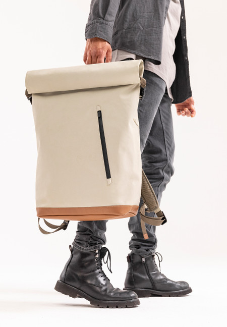 The canvas in our Japan series is made from densely combed and woven organic cotton and finished with a semi-gloss vintage coating. The PFAS free coating gives the styles a water-repellent surface with a leather-like look that polishes with use. We use special high-performance threads for this series that do not absorb water. The rainproof zippers are made from recycled material. The leather applications are made from sustainably tanned premium cowhide. care advice