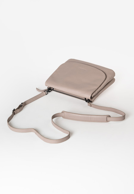 The two-section crossbody bag Jabong is the larger version of Pepino. It is made from grippy, sustainably tanned premium leather and offers clearly organized storage space for everything you need to take with you on the go. One of its two main compartments closes with a flap, the other with a zipper. Inside you find various insert pockets and a key strap. The outer zipper pockets can be secured with a press stud. A shoulder padding makes it particularly comfortable to wear. For special occasions, you can remove the strap and carry Jabong as a large clutch.