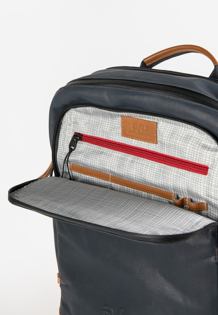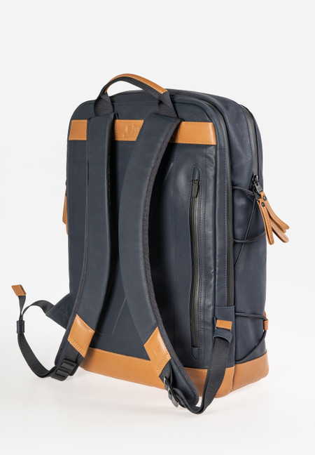 The canvas in our Japan series is made from densely combed and woven organic cotton and finished with a semi-gloss vintage coating. The PFAS free coating gives the styles a water-repellent surface with a leather-like look that polishes with use. We use special high-performance threads for this series that do not absorb water. The rainproof zippers are made from recycled material. The leather applications are made from sustainably tanned premium cowhide. care advice