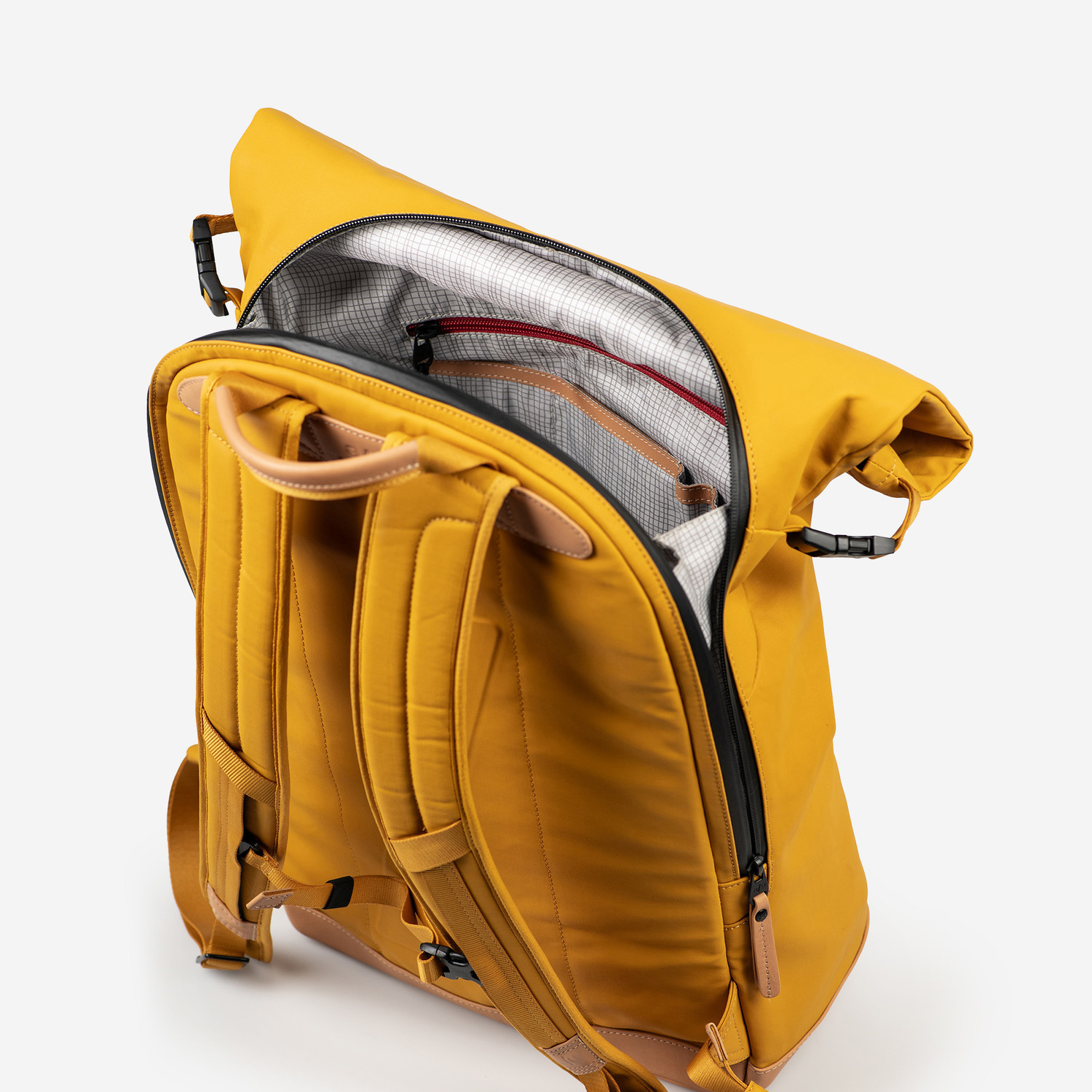 Matsuyama is even a little bit bigger than Fukui and offers space for a notebook up to 16 inches. The lightweight roll-top backpack will certainly never leave you out in the rain. The canvas is made of GOTS-certified organic cotton and has a silk-matt, water-repellent coating. In addition, water-repellent zippers protect the contents of the backpack from rain and splashing water.