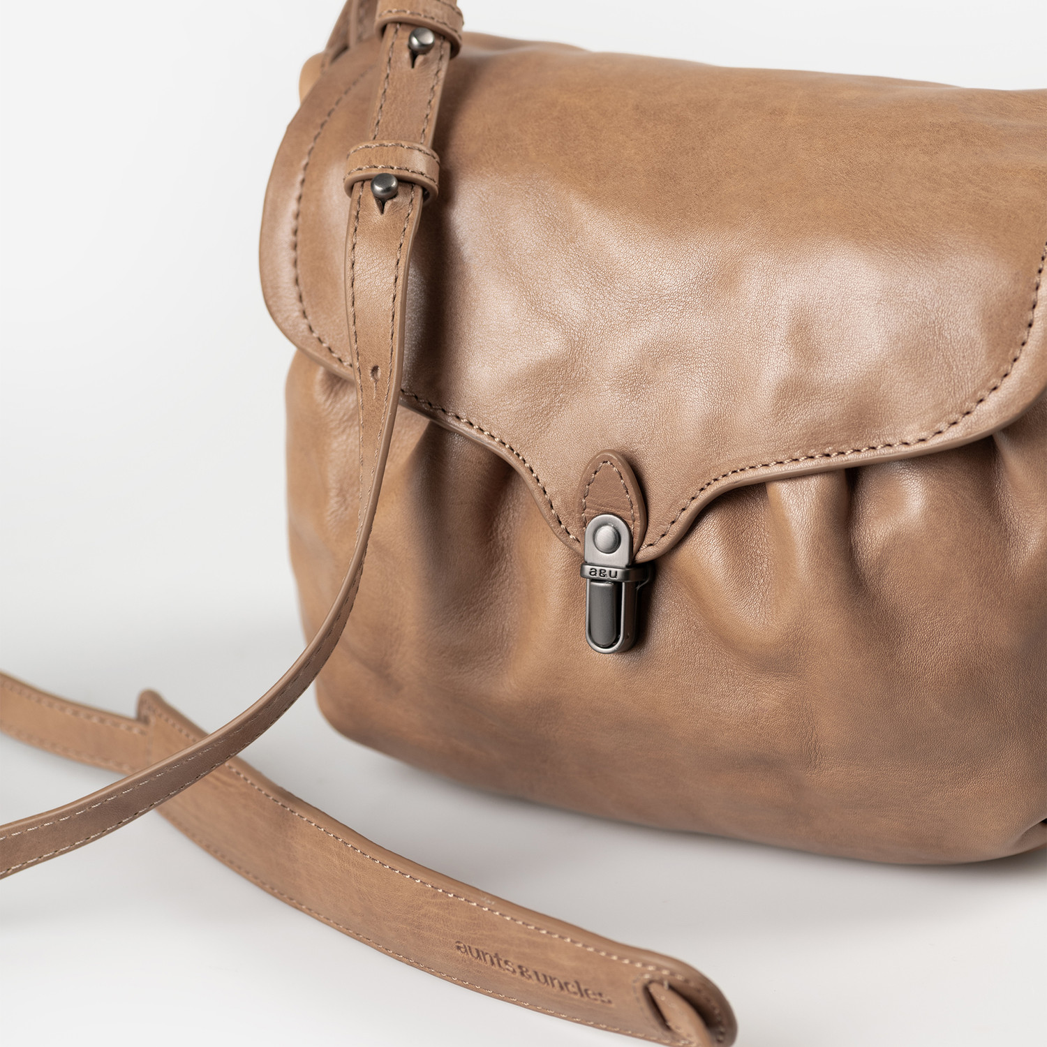 Mrs. Coconut Cake is the smaller version of Mrs. Pineapple Pie. The crossbody bag made from carefully tanned premium leather is perfect for everyday use, as the bulbous design provides plenty of storage in a compact space. The slim buckle, soft gatherings and its rounded shape give the flap bag a feminine aesthetic that harmonizes with many different looks. Under the flap of the bag there is a divided main compartment and an attached front pocket. Various other pockets, a key strap and a removable extra pouch keep everything organized and tidy. The zipper pocket on the back can be closed extra securely with a press stud. To ensure that Mrs. Coconut Cake sits comfortably on your shoulder at all times, the strap is equipped with a shoulder pad.