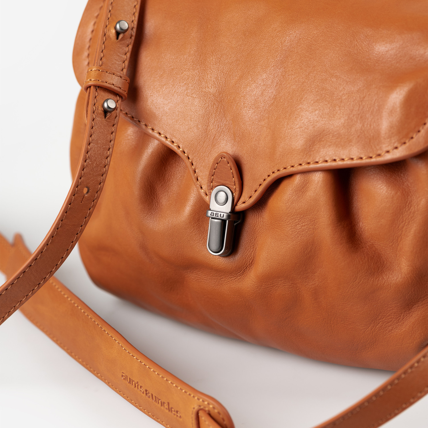 Mrs. Coconut Cake is the smaller version of Mrs. Pineapple Pie. The crossbody bag made from carefully tanned premium leather is perfect for everyday use, as the bulbous design provides plenty of storage in a compact space. The slim buckle, soft gatherings and its rounded shape give the flap bag a feminine aesthetic that harmonizes with many different looks. Under the flap of the bag there is a divided main compartment and an attached front pocket. Various other pockets, a key strap and a removable extra pouch keep everything organized and tidy. The zipper pocket on the back can be closed extra securely with a press stud. To ensure that Mrs. Coconut Cake sits comfortably on your shoulder at all times, the strap is equipped with a shoulder pad.