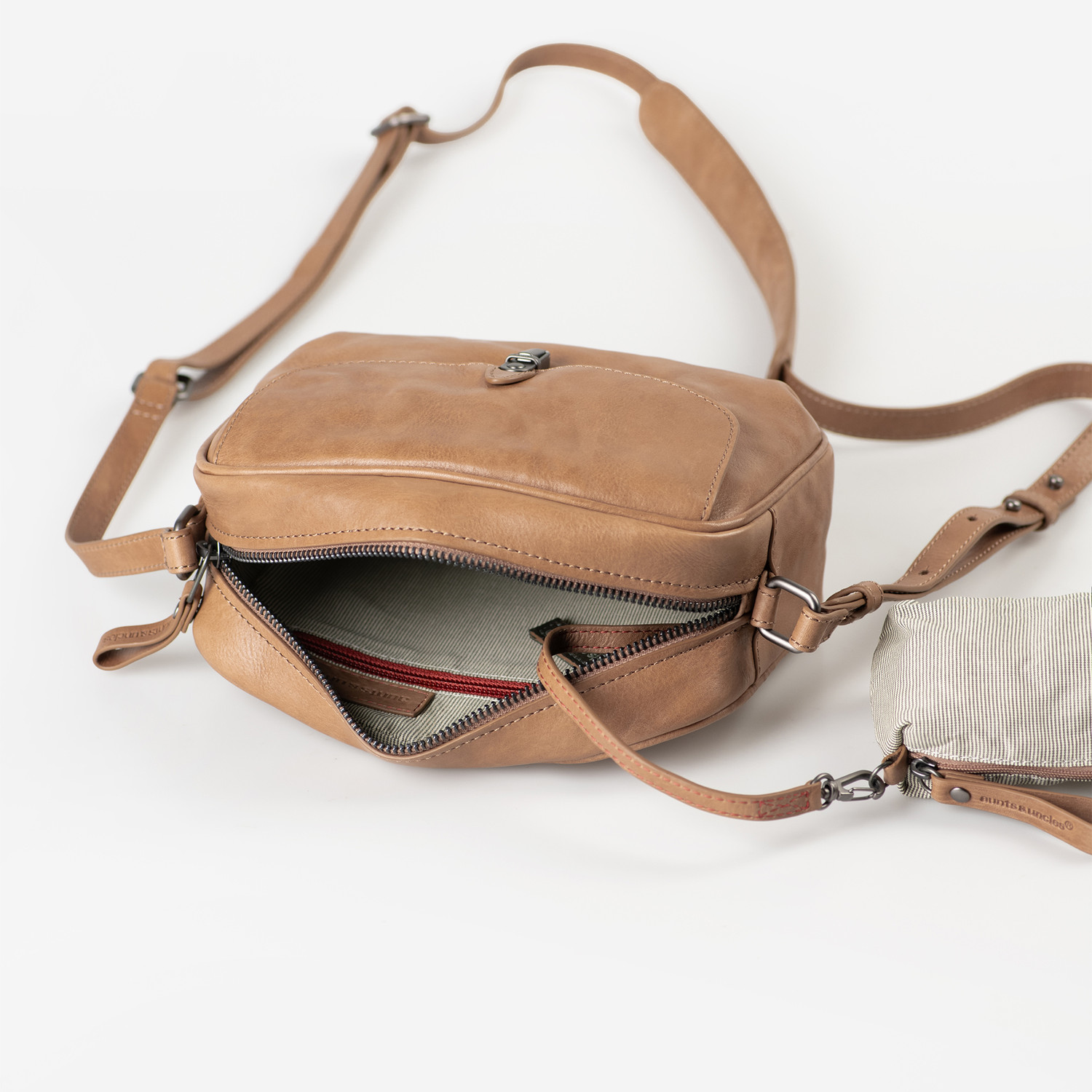 Mrs. Mint is a winner all along the line. A boxy shape and high-quality premium leather ensure an elegant appearance. The main compartment of the camera bag has a practical zipper. A front pocket with a buckle allows quick access to important items, while the extra secure zipper pocket on the back offers space for all those small items that need to be stored close to your body. The interior features additional pockets, accompanied by a removable extra textile pouch and a key strap. A shoulder pad ensures optimum carrying comfort. The striped lining and the dust bag included for storage round off the high-quality overall look of Mrs. Mint.