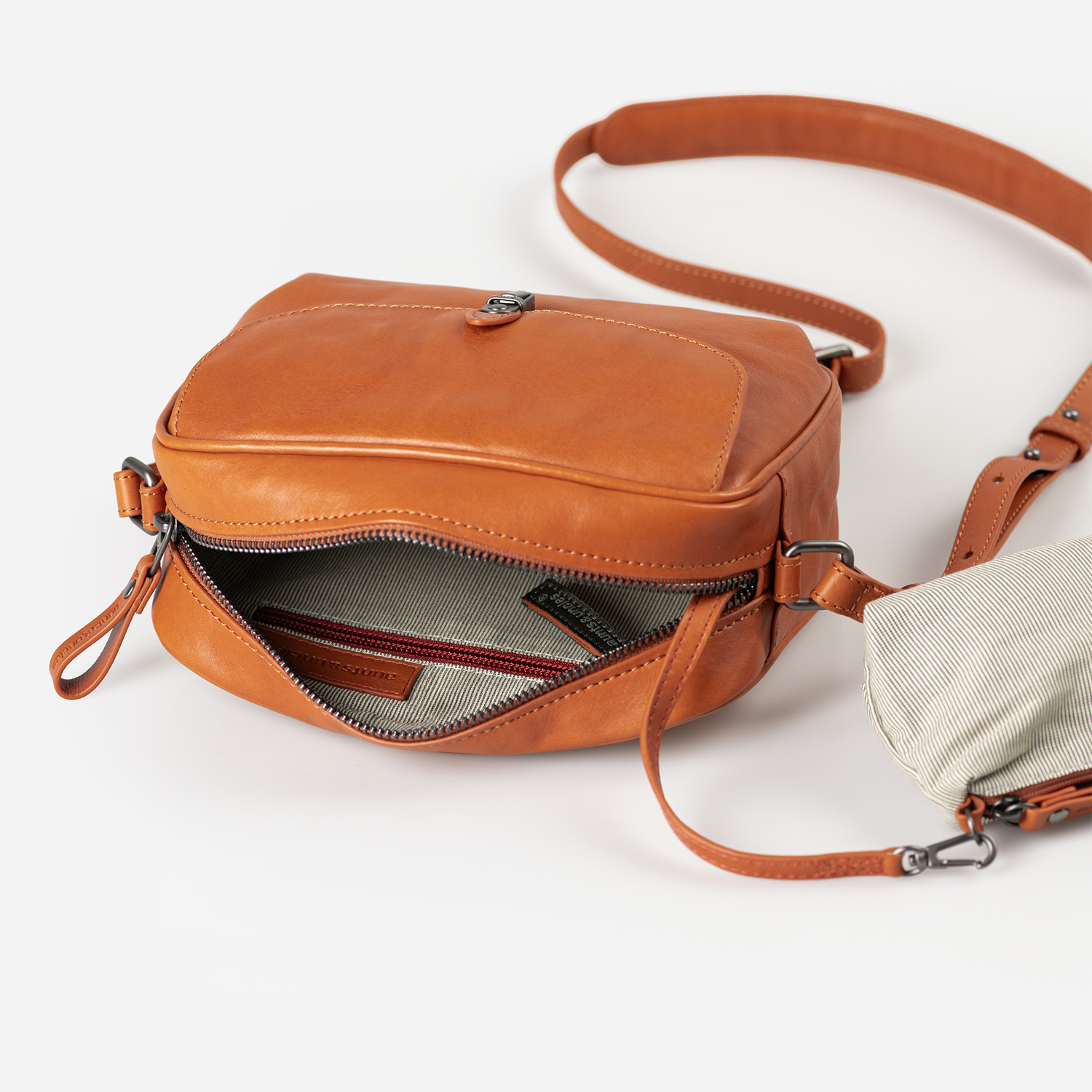 Mrs. Mint is a winner all along the line. A boxy shape and high-quality premium leather ensure an elegant appearance. The main compartment of the camera bag has a practical zipper. A front pocket with a buckle allows quick access to important items, while the extra secure zipper pocket on the back offers space for all those small items that need to be stored close to your body. The interior features additional pockets, accompanied by a removable extra textile pouch and a key strap. A shoulder pad ensures optimum carrying comfort. The striped lining and the dust bag included for storage round off the high-quality overall look of Mrs. Mint.