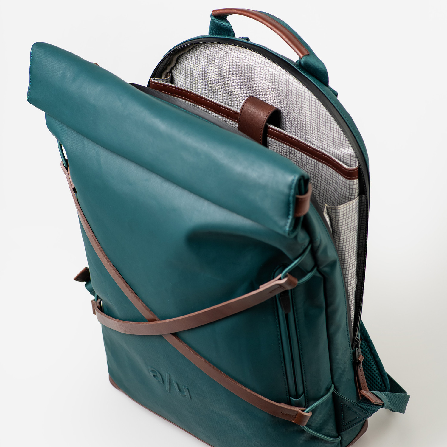 Osaka is the larger version of Yokohama. The two backpacks with the characteristic crossed leather application on the front, are made of semi-gloss coated canvas of densely woven cotton. The backpack with the water-repellent surface offers storage space for documents in A4 and a notebook up to 15 inches. The intelligent interior division with various insertion options and a zippered compartment on the front guarantee clarity and order. Rainproof zippers provide additional protection against moisture and dirt.