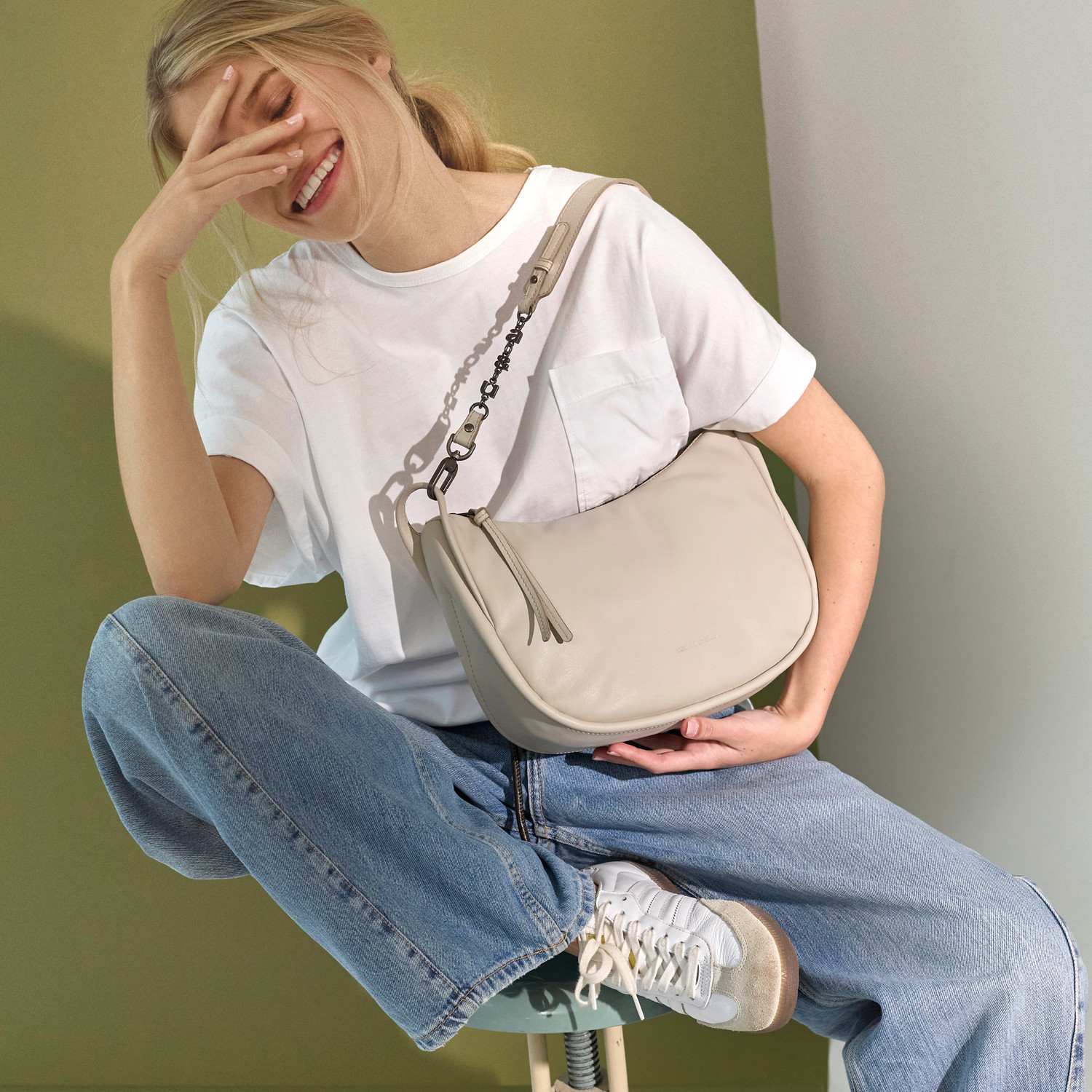 Raven is the larger sister of Fawn – just as stylish, but with even more space for your daily essentials. This halfmoon bag with its signature curved silhouette combines minimalist design with modern functionality and features a special detail: a delicate a&u logo chain element in brushed metal, integrated into the comfortable shoulder strap. Made from soft, high-quality leather, Raven rests gently at your side and confidently accompanies you through the day – whether you're heading to the office, the café, or traveling. A detachable, adjustable crossbody strap adds flexibility to your everyday routine. The reinforced base ensures shape retention. Thoughtful interior compartments and a light-colored lining make Raven a bag that not only looks good but is ready for anything.
