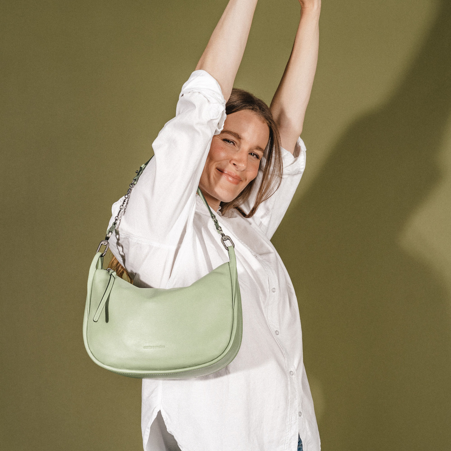 Raven is the larger sister of Fawn – just as stylish, but with even more space for your daily essentials. This halfmoon bag with its signature curved silhouette combines minimalist design with modern functionality and features a special detail: a delicate a&u logo chain element in brushed metal, integrated into the comfortable shoulder strap. Made from soft, high-quality leather, Raven rests gently at your side and confidently accompanies you through the day – whether you're heading to the office, the café, or traveling. A detachable, adjustable crossbody strap adds flexibility to your everyday routine. The reinforced base ensures shape retention. Thoughtful interior compartments and a light-colored lining make Raven a bag that not only looks good but is ready for anything.