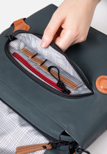 The canvas in our Japan series is made from densely combed and woven organic cotton and finished with a semi-gloss vintage coating. The PFAS free coating gives the styles a water-repellent surface with a leather-like look that polishes with use. We use special high-performance threads for this series that do not absorb water. The rainproof zippers are made from recycled material. The leather applications are made from sustainably tanned premium cowhide. care advice