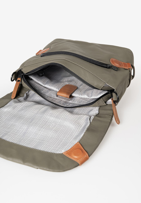 The canvas in our Japan series is made from densely combed and woven organic cotton and finished with a semi-gloss vintage coating. The PFAS free coating gives the styles a water-repellent surface with a leather-like look that polishes with use. We use special high-performance threads for this series that do not absorb water. The rainproof zippers are made from recycled material. The leather applications are made from sustainably tanned premium cowhide. care advice