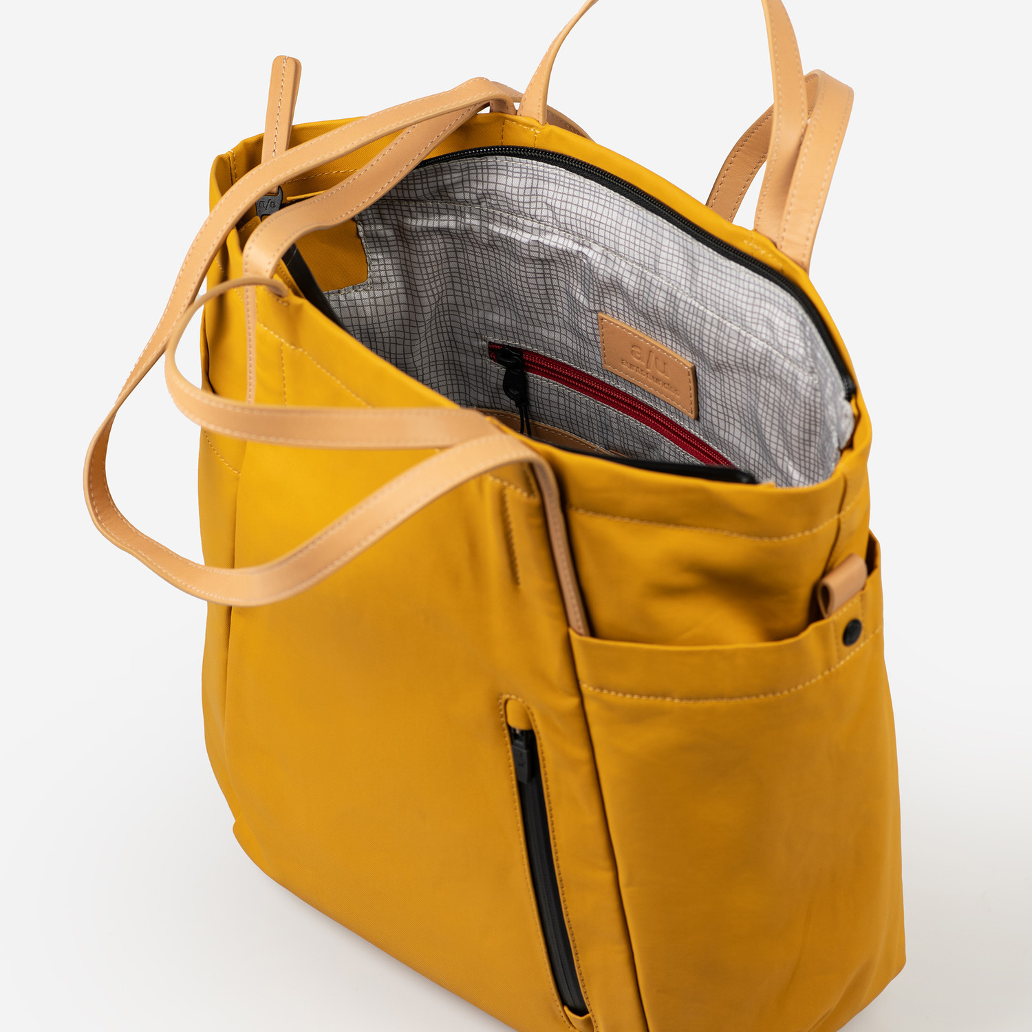 The canvas in our Japan series is made from densely combed and woven organic cotton and finished with a semi-gloss vintage coating. The PFAS free coating gives the styles a water-repellent surface with a leather-like look that polishes with use. We use special high-performance threads for this series that do not absorb water. The rainproof zippers are made from recycled material. The leather applications are made from sustainably tanned premium cowhide. care advice