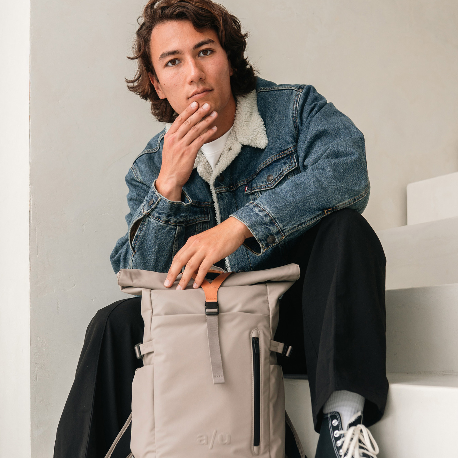 The lightweight yet extremely durable recycled nylon is certified according to the Global Recycled Standard. In addition to a water-repellent impregnation, a PFC- and PFAS-free coating provides reliable protection against moisture and gives the material a highly functional, weather-resistant surface. Furthermore, we use special water-repellent high-performance threads. The zippers are treated with a water-repellent finish. The Aquaguard zippers by YKK are made from recycled PET. The leather details on the non-vegan styles are made from sustainably tanned premium cowhide leather and come from an LWG-certified tannery. The a/u lining is made from recycled polyester. care advice