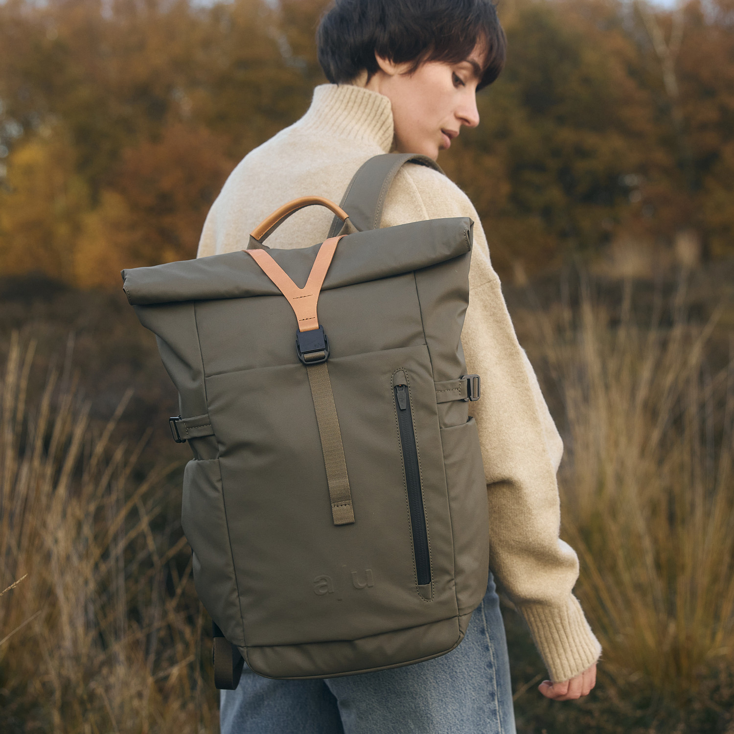 The lightweight yet extremely durable recycled nylon is certified according to the Global Recycled Standard. In addition to a water-repellent impregnation, a PFC- and PFAS-free coating provides reliable protection against moisture and gives the material a highly functional, weather-resistant surface. Furthermore, we use special water-repellent high-performance threads. The zippers are treated with a water-repellent finish. The Aquaguard zippers by YKK are made from recycled PET. The leather details on the non-vegan styles are made from sustainably tanned premium cowhide leather and come from an LWG-certified tannery. The a/u lining is made from recycled polyester. care advice