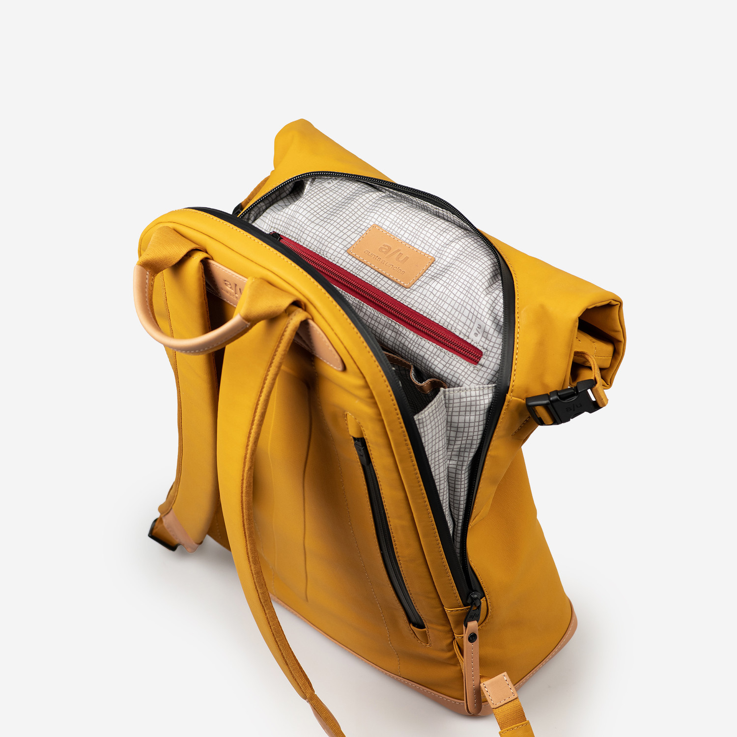 New York - Rio - Tokio... This light-weight backpack with its practical roll-top opening is at home anywhere and offers you space for A4 documents and a notebook up to 13 inches in addition to waterproof zippers and authentic leather applications. The water-repellent cotton fabric has a silk matt coating and polishes with use. The leather comes from a GOLD-certified tannery that is a member of the Leather Working Group, which focuses on responsible and environmentally conscious leather production.