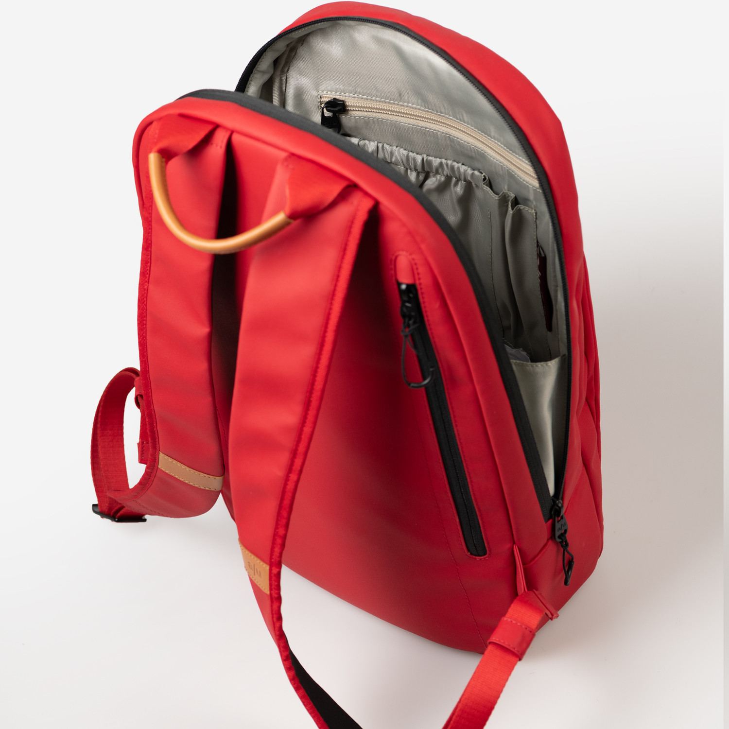 The lightweight yet extremely durable recycled nylon is certified according to the Global Recycled Standard. In addition to a water-repellent impregnation, a PFC- and PFAS-free coating provides reliable protection against moisture and gives the material a highly functional, weather-resistant surface. Furthermore, we use special water-repellent high-performance threads. The zippers are treated with a water-repellent finish. The Aquaguard zippers by YKK are made from recycled PET. The leather details on the non-vegan styles are made from sustainably tanned premium cowhide leather and come from an LWG-certified tannery. The a/u lining is made from recycled polyester. care advice