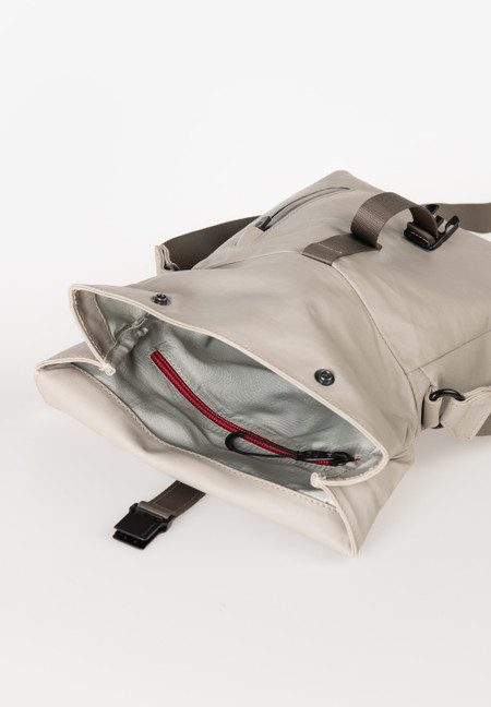The lightweight yet extremely durable recycled nylon is certified according to the Global Recycled Standard. In addition to a water-repellent impregnation, a PFC- and PFAS-free coating provides reliable protection against moisture and gives the material a highly functional, weather-resistant surface. Furthermore, we use special water-repellent high-performance threads. The zippers are treated with a water-repellent finish. The Aquaguard zippers by YKK are made from recycled PET. The leather details on the non-vegan styles are made from sustainably tanned premium cowhide leather and come from an LWG-certified tannery. The a/u lining is made from recycled polyester. care advice
