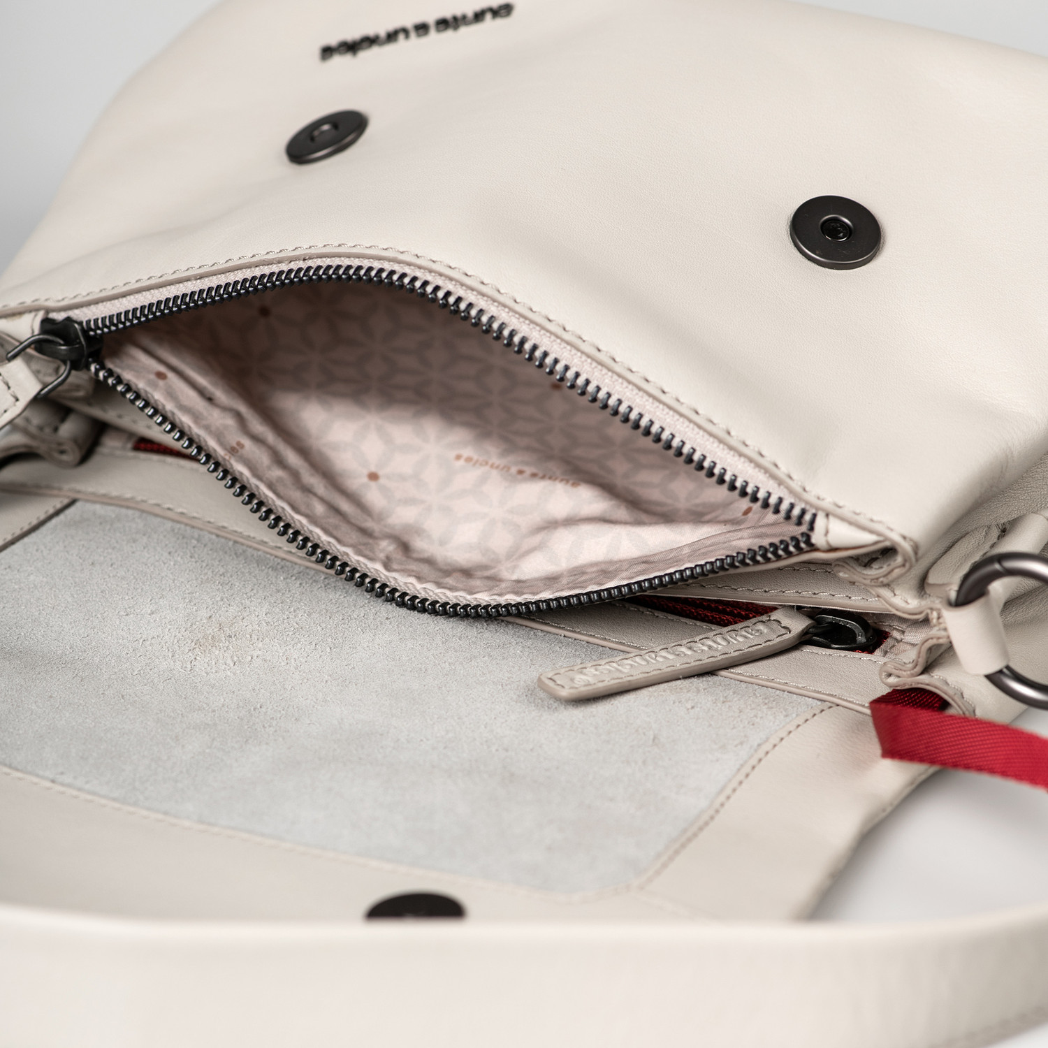 Das weiche, griffige Rindleder ist sorgsam semi-vegetabil. Handwerkliche Details unterstreichen Qualität und Individualität der Styles. Die hochwertige Hardware in smokey Grey ist matt gebürstet.Pflegeempfehlung