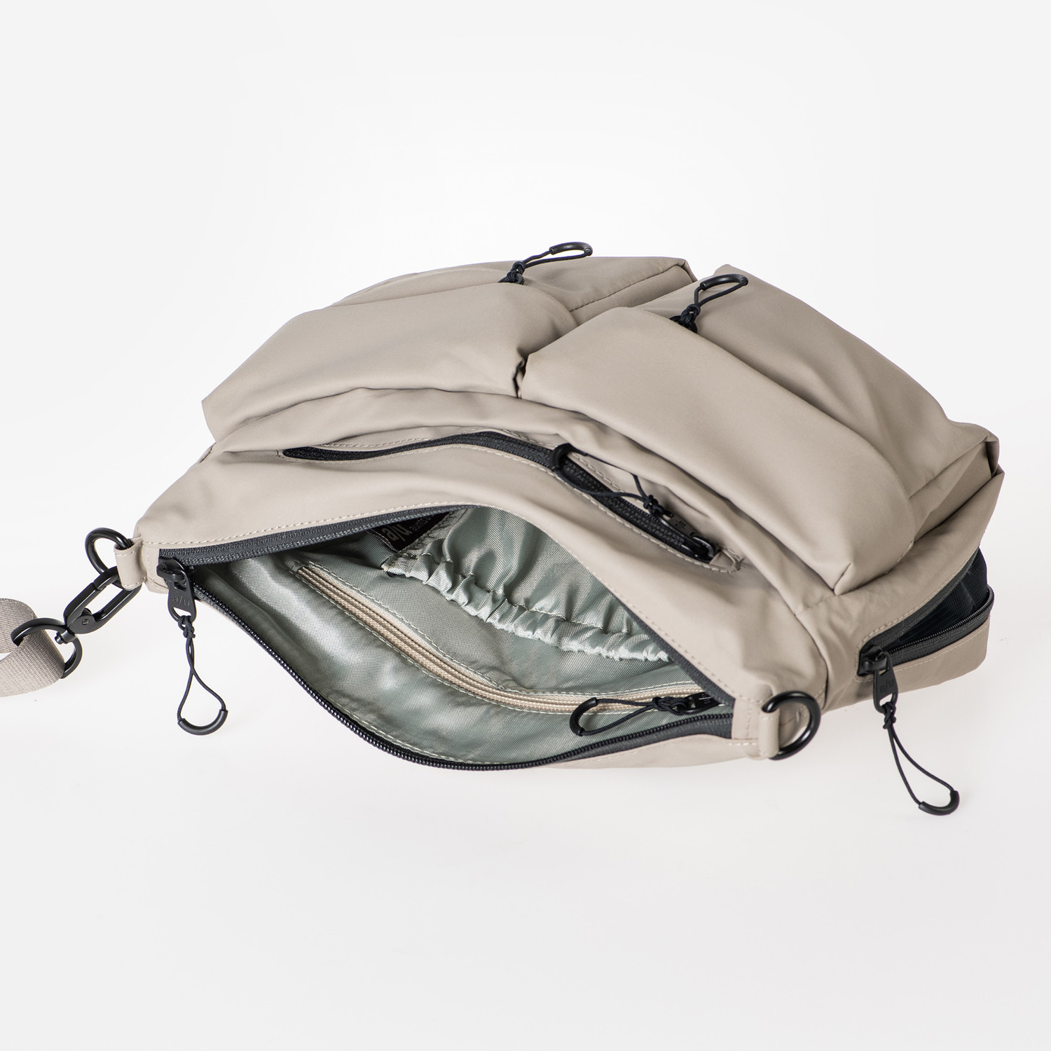Ebenso wie die größere Variante Omono besticht Mogami durch übersichtlichen Stauraum in knautschiger Form. Die regenfeste Umhängetasche ist aus leichtem, recyceltem Nylon gefertigt. Das puffige Design verleiht deinem Look einen lässigen, sportiven Touch. Das Hauptfach mit Reißverschluss bietet ausreichend Platz für deine täglichen Essentials, während äußere Reißverschlussfächer schnellen Zugriff auf wichtige Gegenstände ermöglichen. Dank des umlaufenden Reißverschlusses lässt sich das Taschenvolumen nach Bedarf erweitern, sodass du immer genügend Platz für alles hast, was du mitnehmen möchtest.