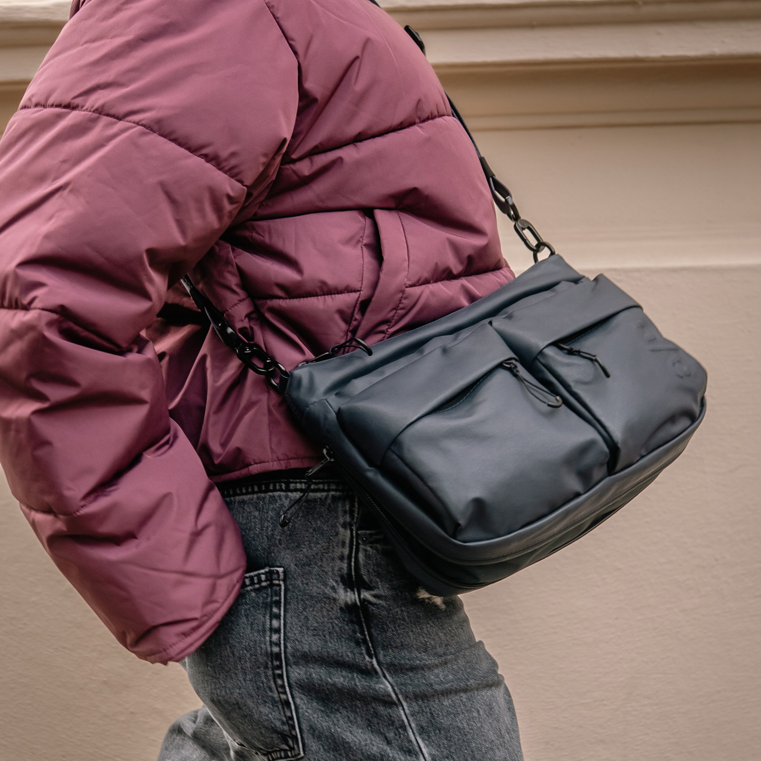 Ebenso wie die größere Variante Omono besticht Mogami durch übersichtlichen Stauraum in knautschiger Form. Die regenfeste Umhängetasche ist aus leichtem, recyceltem Nylon gefertigt. Das puffige Design verleiht deinem Look einen lässigen, sportiven Touch. Das Hauptfach mit Reißverschluss bietet ausreichend Platz für deine täglichen Essentials, während äußere Reißverschlussfächer schnellen Zugriff auf wichtige Gegenstände ermöglichen. Dank des umlaufenden Reißverschlusses lässt sich das Taschenvolumen nach Bedarf erweitern, sodass du immer genügend Platz für alles hast, was du mitnehmen möchtest.