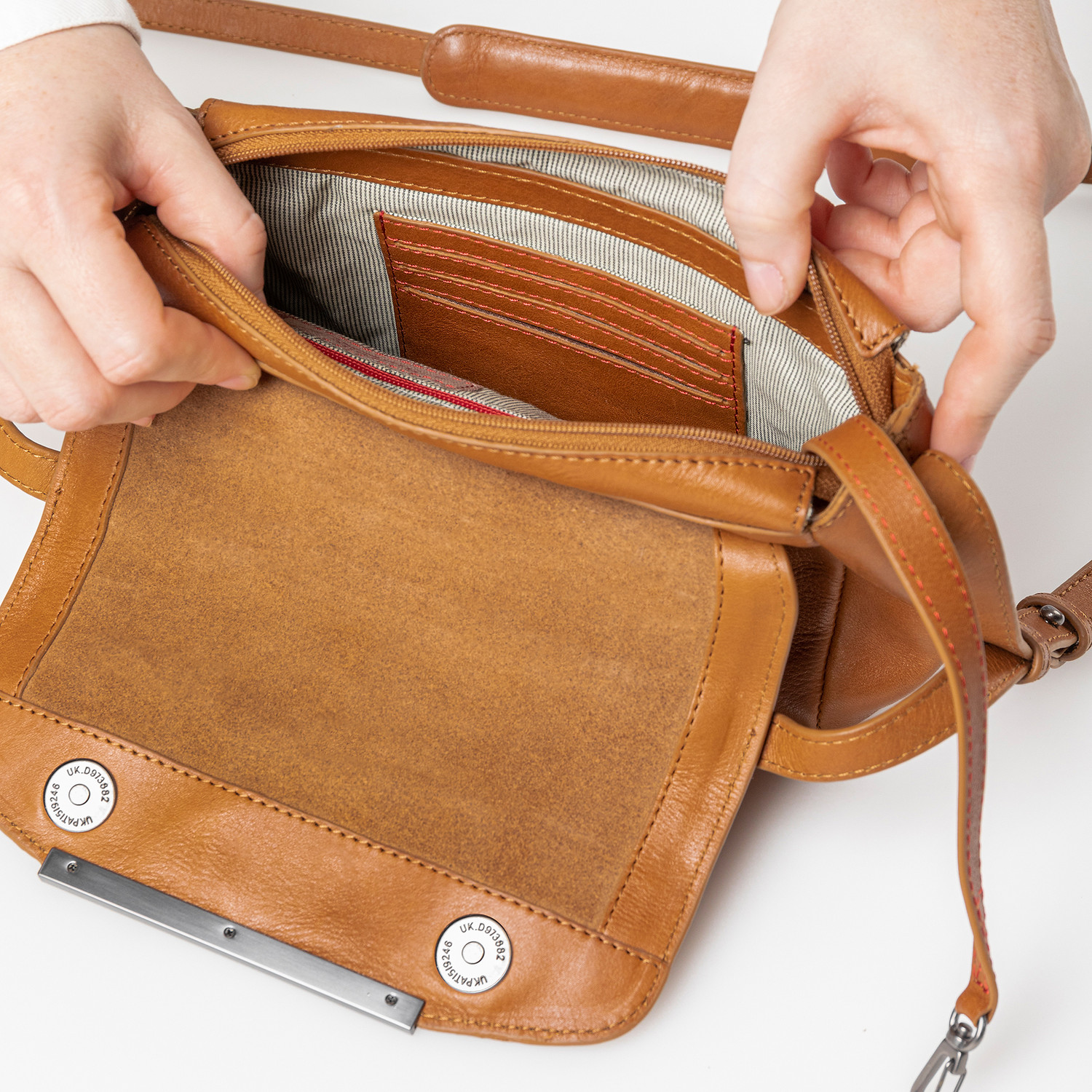 • Reißverschlussfach auf der Rückseite und Druckknopf für Zipper