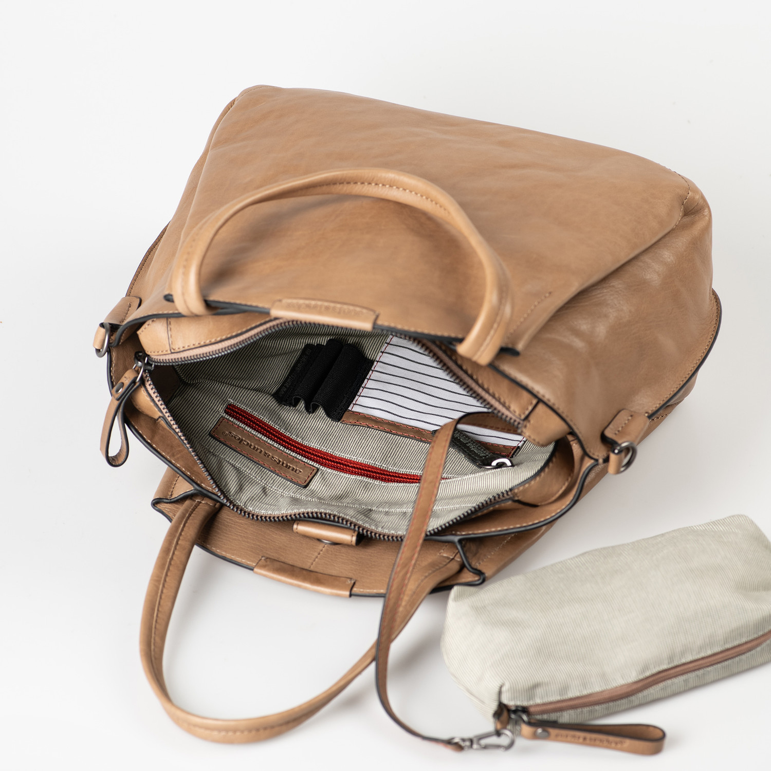 Typisch für unsere Taschen aus Grandma's Luxury Club verbindet Mrs. Chiffon Pie modern interpretierten Retro-Charme mit charakterstarkem Leder und Liebe zum Detail. Die trapezförmige Handtasche ist dreifach unterteilt. Das Hauptfach schließt mit einem Reißverschluss. Zwei weitere äußere Fächer lassen sich mit einem Druckknopf schließen. Im Inneren findest du verschiedene Einsteckmöglichkeiten, ein Schlüsselband und ein herausnehmbares Extra-Täschchen. Metallfüßchen schützen den Boden vor Nässe und Schmutz. Du kannst Mrs. Chiffon Pie klassisch in der Hand oder in der Armbeuge tragen. Optional bietet dir der mitgelieferte lange Umhängegurt eine Crossbody-Tragevariante.