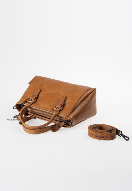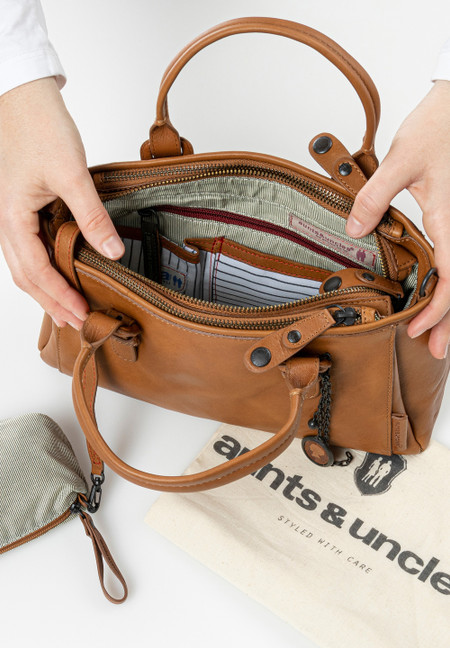 Die ordnungsliebende Mrs. Choco Sprinkle ist nicht nur ein echter Augenschmaus. Mit ihren drei separaten Hauptfächern und zahlreichen Einsteckmöglichkeiten im Inneren ist sie eine charmante Begleitung für alle, die es aufgeräumt mögen. Das hoch vegetabil gegerbte Premium-Rindleder der adretten Handtasche erhält durch eine besonders schonende Trocknung seinen typischen, knitterigen Look.