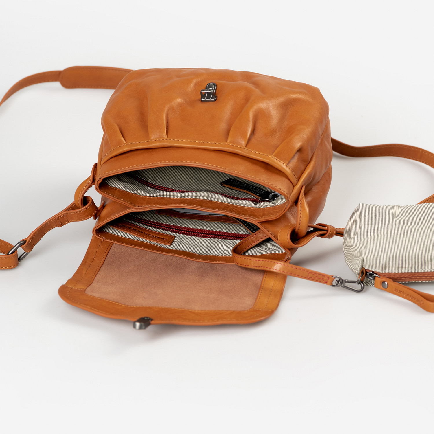 Mrs. Coconut Cake ist die kleinere Variante von Mrs. Pineapple Pie. Die Umhängetasche aus sorgsam gegerbtem Premium-Leder ist perfekt für den Alltag, denn das bauchige Design sorgt für reichlich Platz auf kompaktem Raum. Das schmale Steckschloss, die weiche Raffung und die abgerundete Form verleihen der Flap Bag eine feminine Ästhetik, die mit vielerlei Looks harmoniert. Unter dem Überschlag der Tasche finden sich ein zweigeteiltes Hauptfach sowie ein aufgesetztes vorderes Fach. Verschiedene weitere Einsteckmöglichkeiten, ein Schlüsselband und ein herausnehmbares Extra-Täschchen sorgen für Ordnung und Übersicht. Das rückseitige Reißverschlussfach lässt sich mit einem Druckknopf extra sicher verschließen. Damit Mrs. Coconut Cake jederzeit angenehm auf deiner Schulter liegt, ist der Umhängegurt mit einem bequemen Polster ausgestattet.
