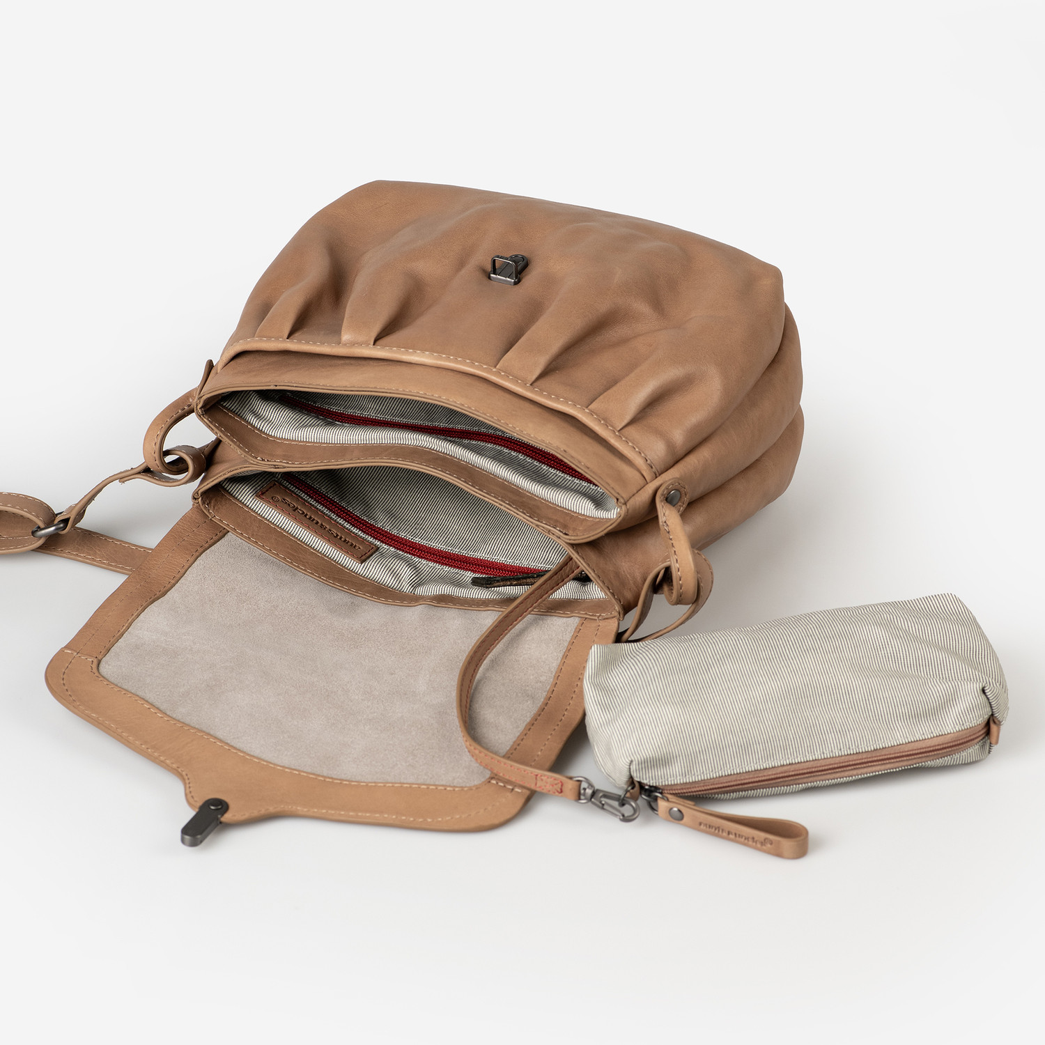Wenn du klassisch anmutende Taschen mit strukturiertem Stauraum für gute Übersicht liebst, dann ist Mrs. Pineapple Pie genau die Richtige für dich. Die Überschlagtasche mit der zart gerafften Front und der bauchigen Form ist die größere Variante von Mrs. Coconut Cake und wird aus charakterstarkem Premium-Leder handgefertigt, mit viel Liebe zum Detail. Unter dem Überschlag befinden sich ein unterteiltes Hauptfach und ein aufgesetztes Vorfach. Weitere Einsteckmöglichkeiten im Inneren, ein Schlüsselband und ein herausnehmbares Extra-Täschchen sorgen dafür, dass deine Essentials jederzeit perfekt organisiert sind. Das Reißverschlussfach auf der Rückseite ist mit einem zusätzlichen Druckknopf gesichert. Ein Schulterpolster sorgt für angenehmen Tragekomfort.