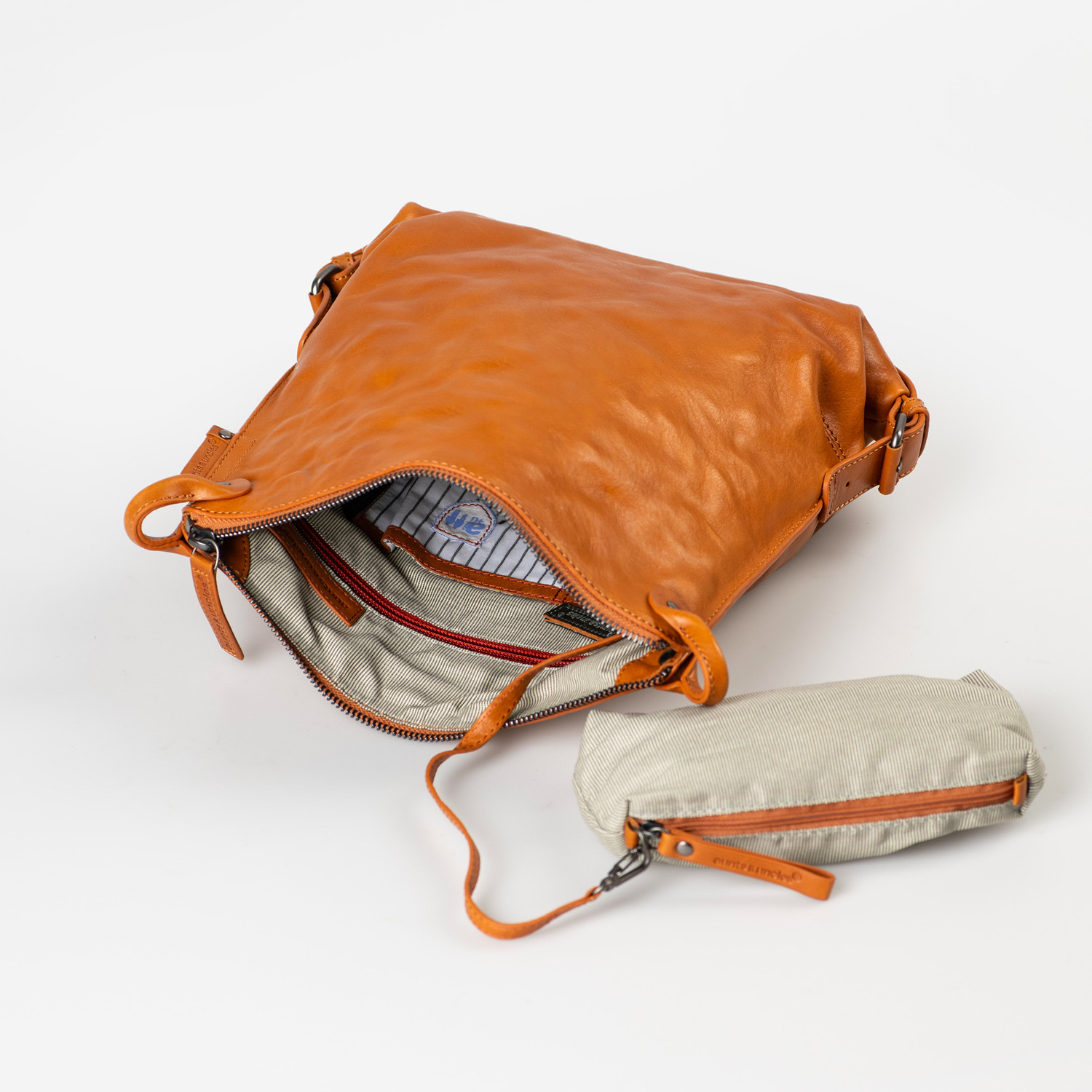 Mrs. Raisin Cookie ist die etwas größere Schwester von Mrs. Chocolate Cookie und macht ihrem Namen alle Ehre, denn das Leder der adretten Umhängetasche entzückt mit einer, für die Styles aus Grandma's Luxury Club charakteristischen, welligen Optik. Im Inneren schmückt sich Mrs. Raisin Cookie mit einem schlichten, gestreifen Futterstoff und ganz viel praktischer Organisation.