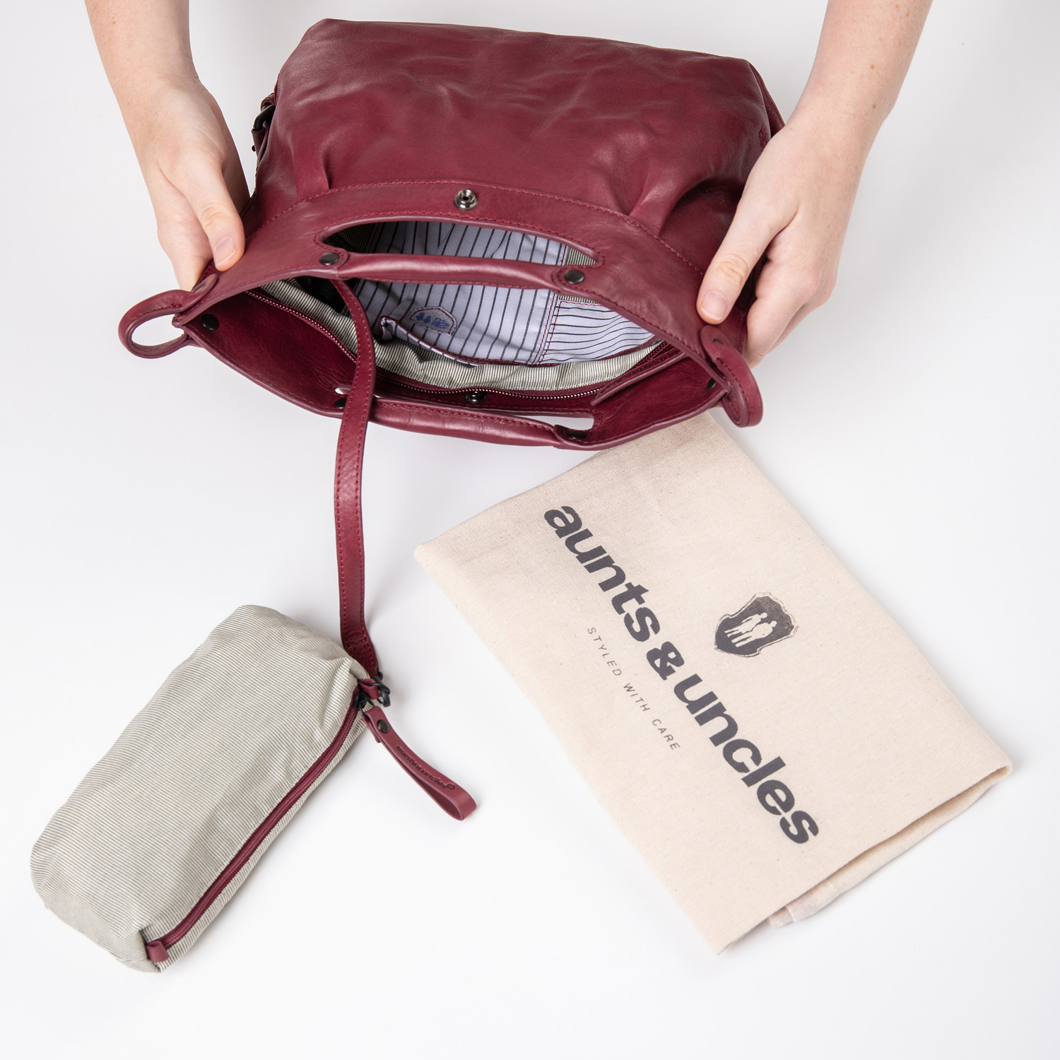 Das Premium-Rindleder in Grandma's Luxury Club ist ein hoch vegetabil gegerbtes Anilinleder mit welligem Look. Die charakteristischen matten und glänzenden Kontraste entstehen durch sorgfältige händische Nachbearbeitung und machen jedes Stück zu einem Unikat. Pflegeempfehlung