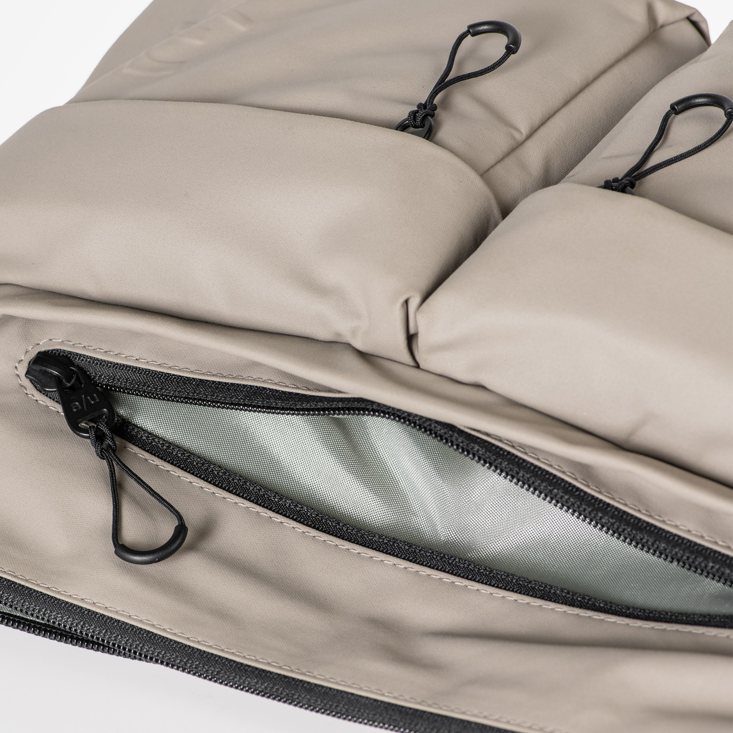 Alle Styles haben eine wasserabweisende Imprägnierung. Ein zusätzliches PFAS-freies Coating verleiht ihnen eine hochfunktionelle, wasserabweisende Oberfläche. Darüber hinaus verwenden wir spezielle Hochleistungsfäden, die kein Wasser ziehen. Die Styles in der Farbe cloud nine sind aus dicht gewebtem, nach dem Global Recycled Standard zertifiziertem Nylon gefertigt und mit einer zusätzlichen schmutzabweisenden Beschichtung versehen. Das dicht gewebte Ripstop-Material der Modelle in der Farbe black besteht aus recyceltem Nylon und GOTS zertifizierter Baumwolle. Im Inneren ist ein strapazierfähiger Futterstoff aus recyceltem Polyester verarbeitet.