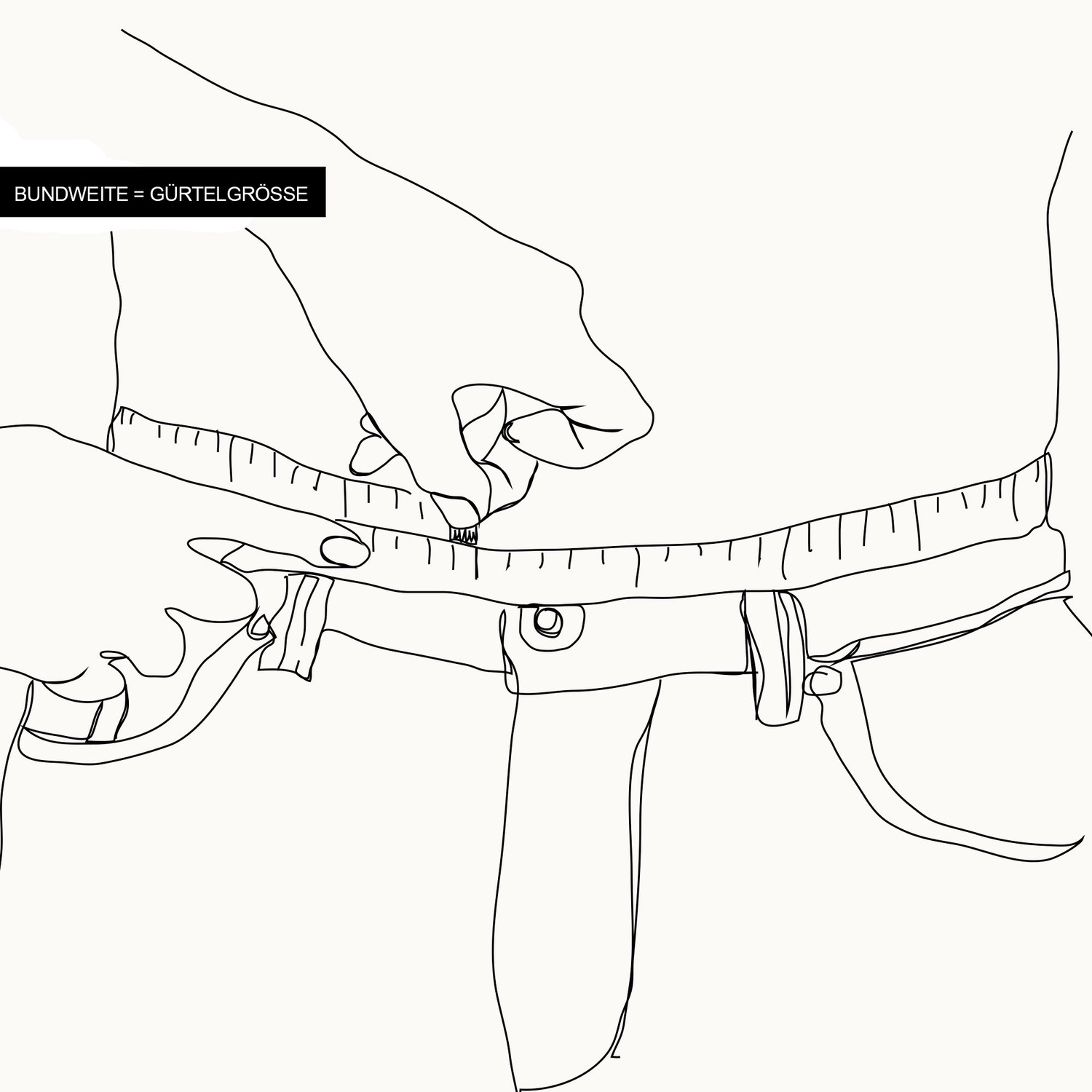 Die richtige Größe: Damit der Gürtel in einem der mittleren Löcher schließt und damit perfekt passt, misst du an einer gut sitzenden Hose deine Bundweite. (siehe Abbildung) Deine Bundweite ist deine Gürtelgröße.